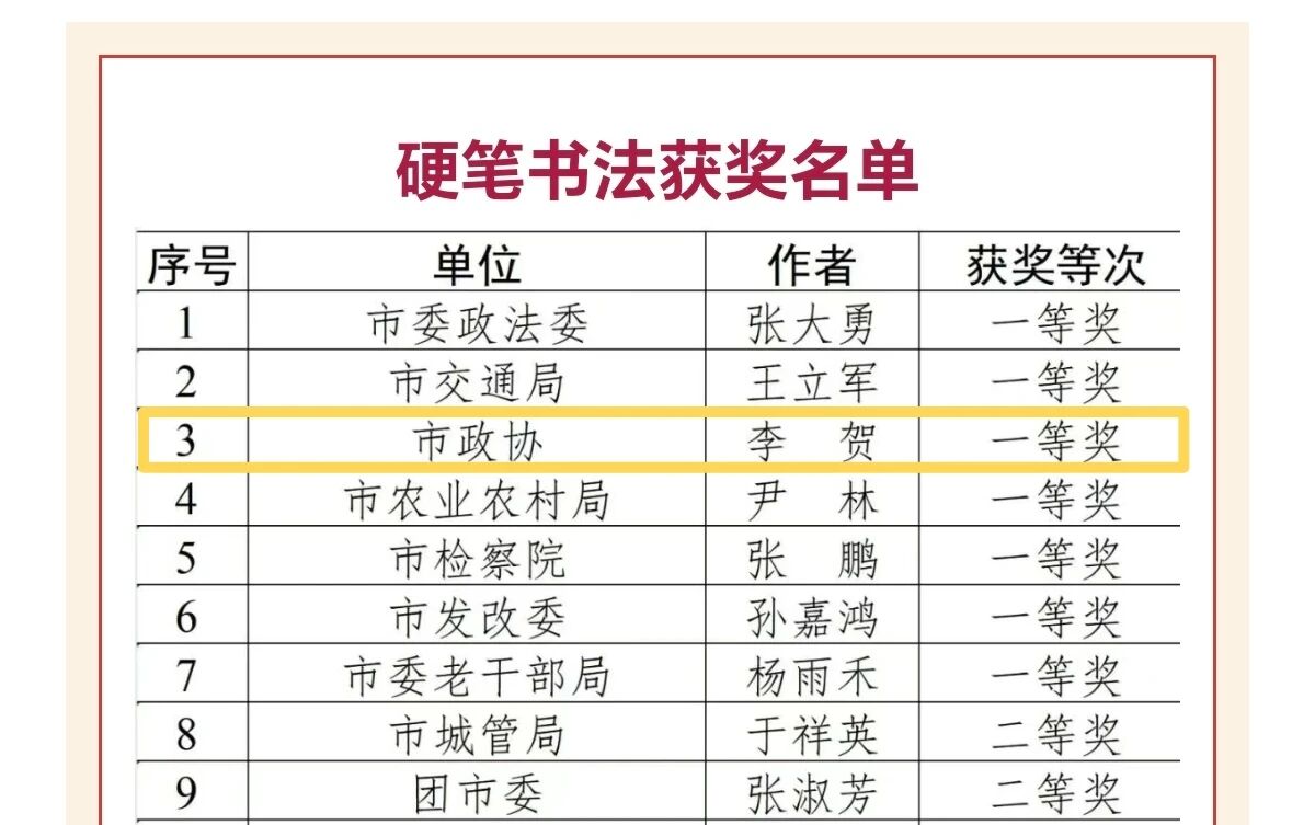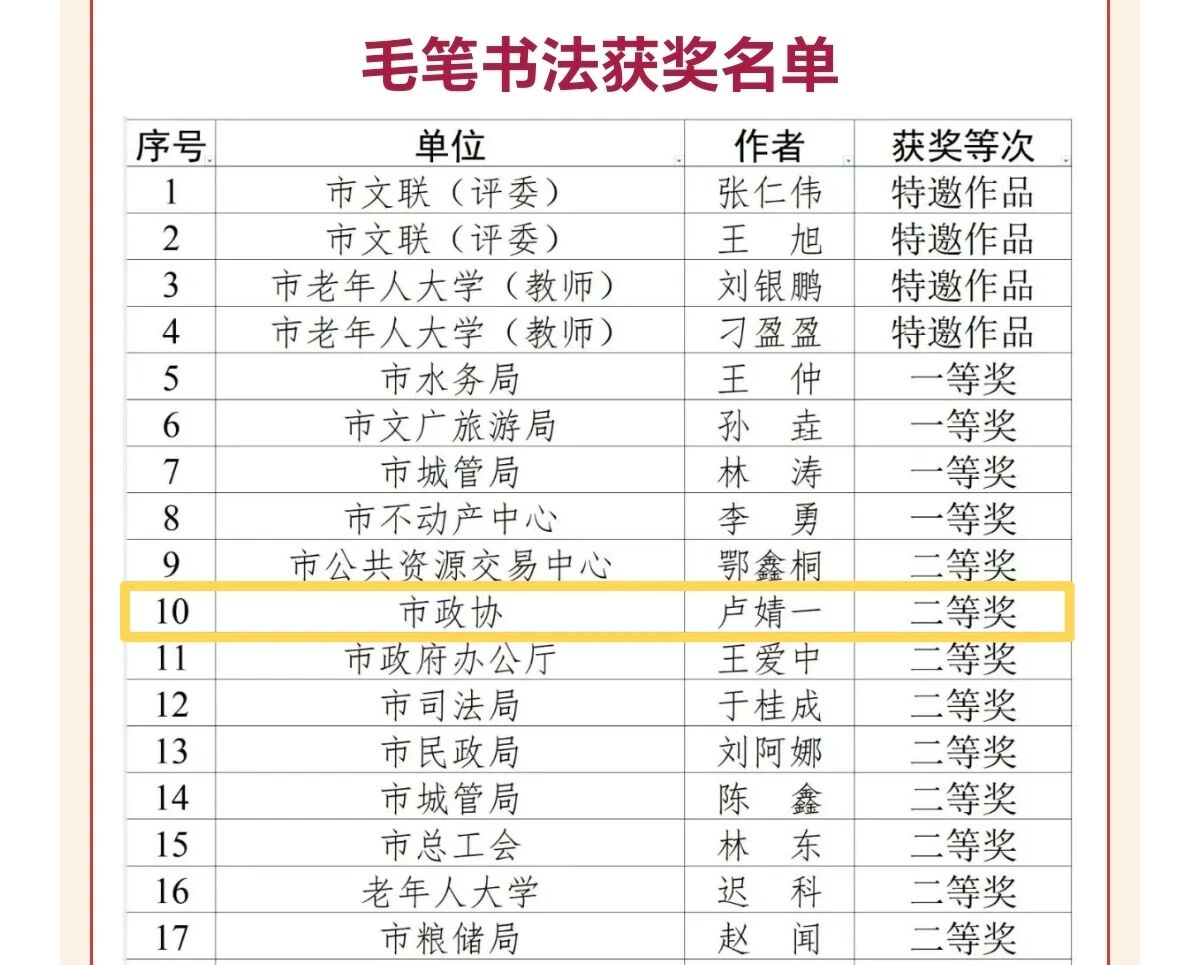 接到相关通知后,市政协两级党组高度重视,市政协机关党委、机关纪委与机关工会认真组织筹备,机关党员干部职工积极响应,利用业余时间围绕主题精心创作并报送。在市文联哈尔滨画院、市美术家协会、市书法家协会、市摄影家协会等相关专家严格评审后,3幅作品在415幅作品中脱颖而出、斩获奖项,较好展示了市政协机关党员干部职工的艺术才华和精神风貌。其中,高巍作品《高远如岚山》获“绘画作品”一等奖,李贺作品《敬录习主席抗战胜利八十周年讲话(节选)》获“硬笔书法”一等奖,卢婧一作品《念奴娇·井冈山——毛泽东》获“毛笔书法”二等奖,市政协机关荣获优秀组织奖。