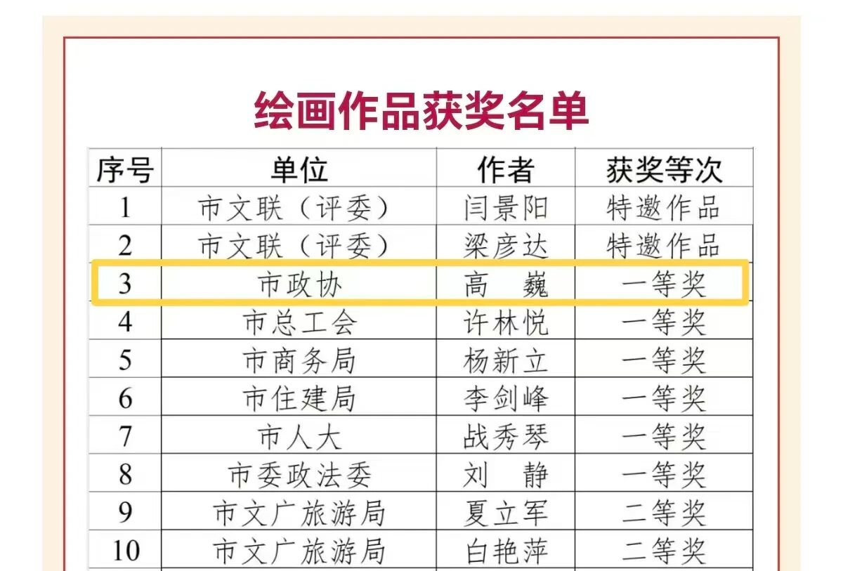 接到相关通知后,市政协两级党组高度重视,市政协机关党委、机关纪委与机关工会认真组织筹备,机关党员干部职工积极响应,利用业余时间围绕主题精心创作并报送。在市文联哈尔滨画院、市美术家协会、市书法家协会、市摄影家协会等相关专家严格评审后,3幅作品在415幅作品中脱颖而出、斩获奖项,较好展示了市政协机关党员干部职工的艺术才华和精神风貌。其中,高巍作品《高远如岚山》获“绘画作品”一等奖,李贺作品《敬录习主席抗战胜利八十周年讲话(节选)》获“硬笔书法”一等奖,卢婧一作品《念奴娇·井冈山——毛泽东》获“毛笔书法”二等奖,市政协机关荣获优秀组织奖。